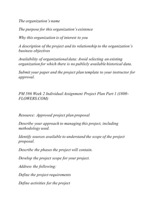 The document outlines a series of assignments for a project management course (PM 586) focused on creating comprehensive project proposals for various organizations, such as 1800-flowers.com, Coral Police Advance Training Facility, and Georgia Head Start. Each assignment consists of multiple parts, including selecting an organization, defining project scope and requirements, developing budgets, risk management plans, and strategies for project execution and monitoring. The course emphasizes the practical application of project management methodologies and principles.