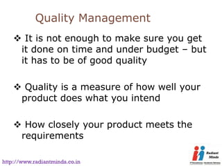 The document discusses quality management in software development. It states that quality is a measure of how well a product meets its intended requirements. It also discusses defining quality attributes, establishing quality controls through tools like control charts, and ensuring quality through standards like ISO 9000 and the Capability Maturity Model. Quality management involves planning, controlling, and assuring quality through all stages of development.