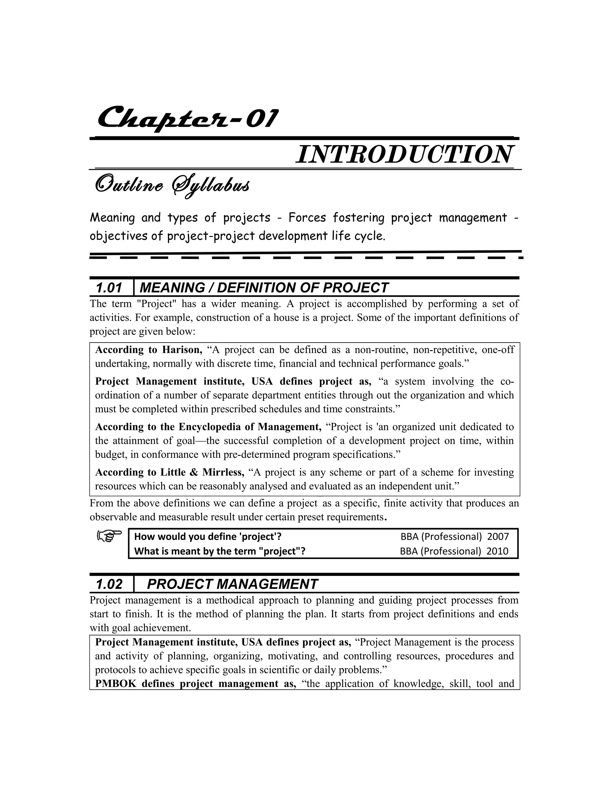 This document provides an introduction to project management concepts. It defines a project as a specific, finite activity that produces an observable and measurable result under certain preset requirements. Project management is defined as an approach to management of work within the constraints of time, cost, and performance requirements. The key objectives of a project are scope, performance, time and cost. Projects can be classified based on duration, investment amount, ownership, and risk. The project life cycle consists of initiation, planning, execution/monitoring/control, and closure phases. Effort levels are lowest at the start and end of a project and highest during the intermediate phases.