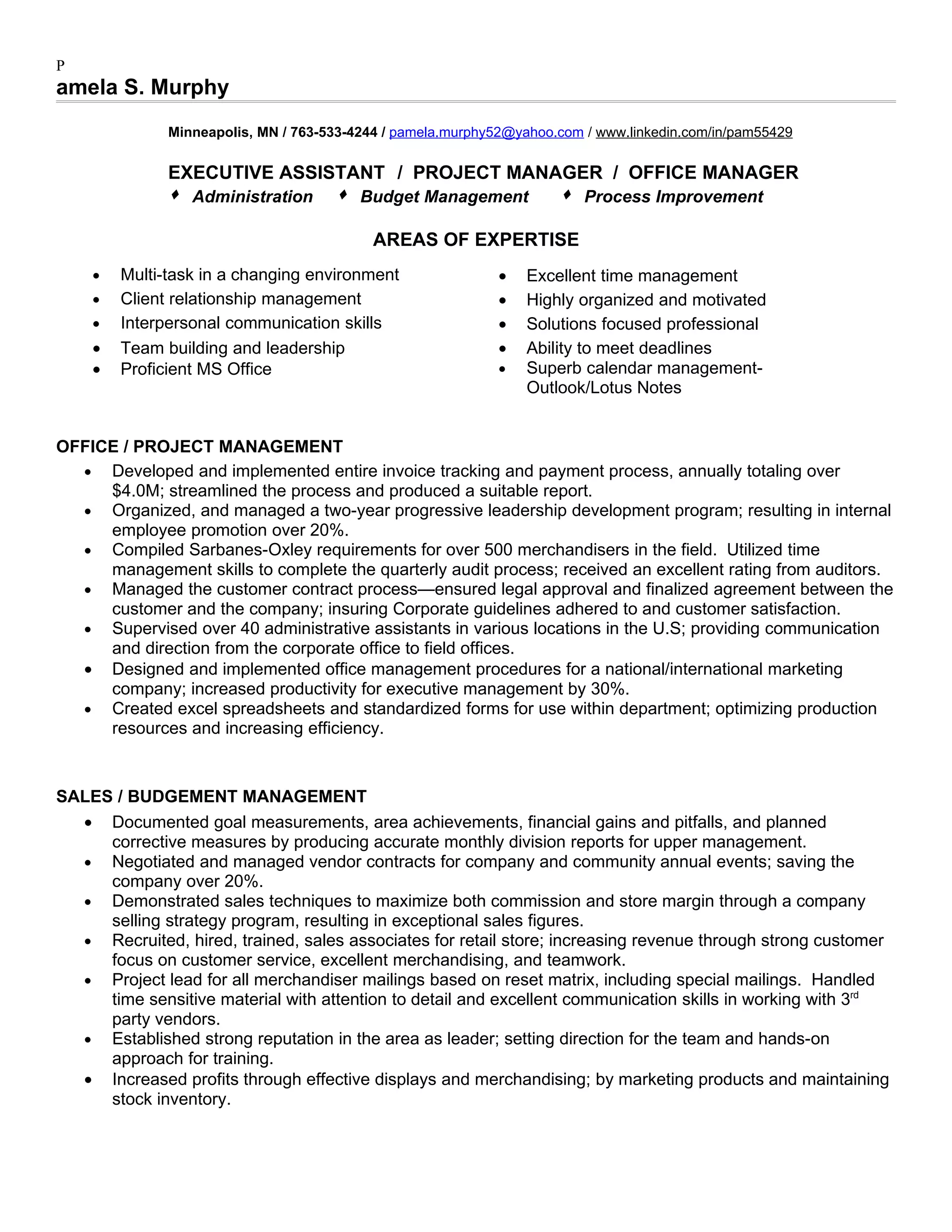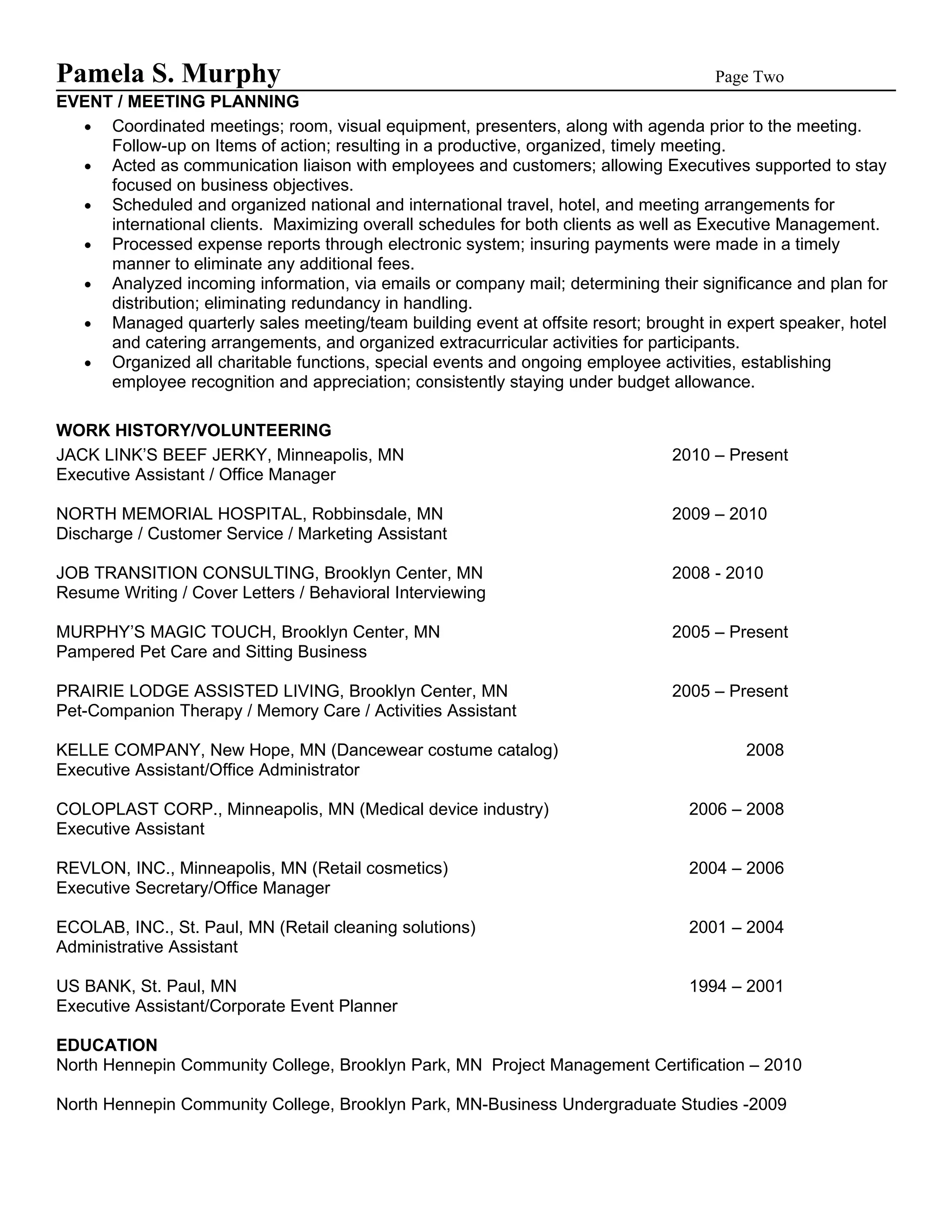Pamela S. Murphy is an experienced executive assistant, project manager, and office manager with over 20 years of experience. She has a proven track record of streamlining processes, improving productivity, managing budgets, and developing leadership programs. Her skills include client relationship management, communication, organization, and meeting planning and facilitation. She currently works as an Executive Assistant and Office Manager at Jack Link's Beef Jerky in Minneapolis, MN.