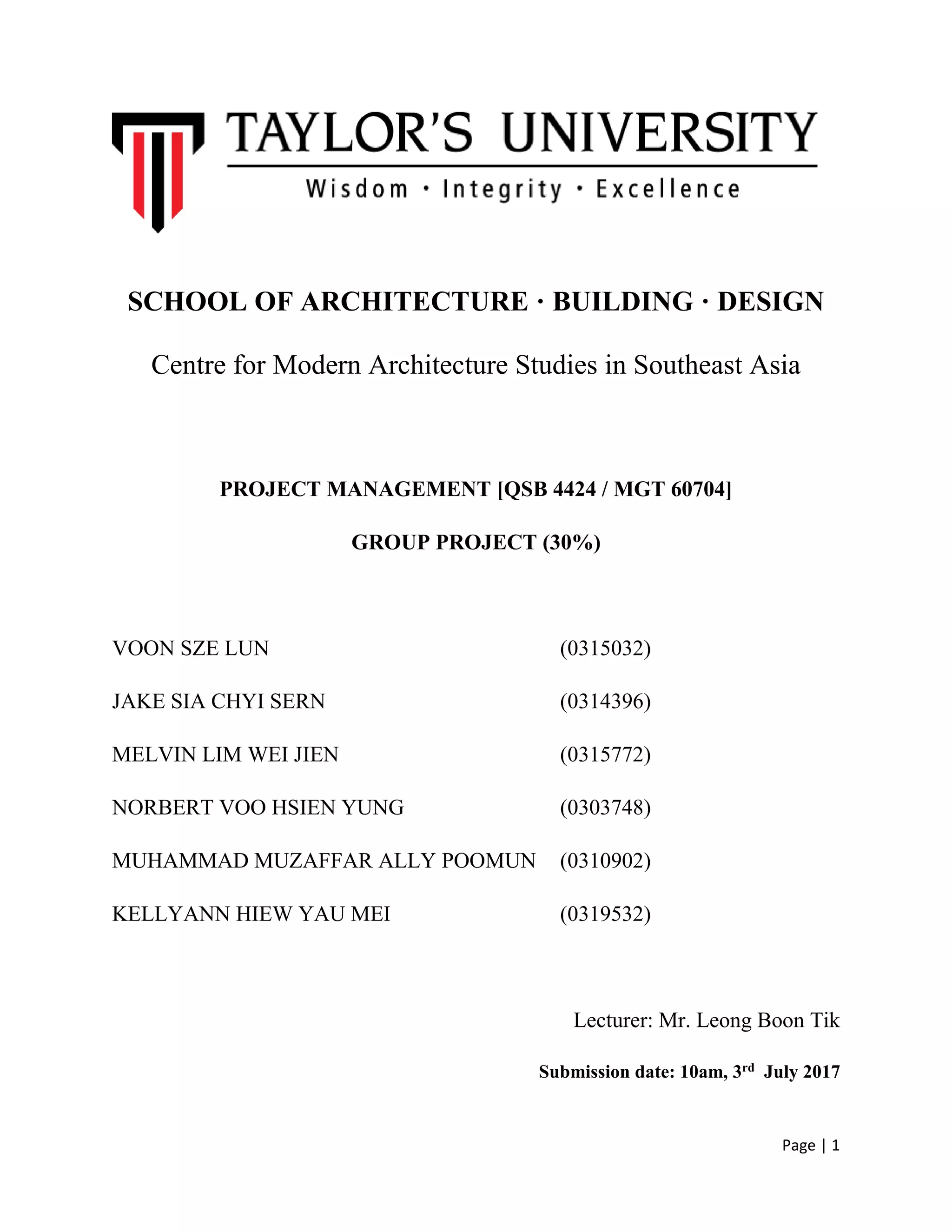 This document outlines a proposed multipurpose building project for Taylor's University. It will include lecture theaters, X-space classrooms, food retail shops, and basement parking on a rented 1200 sqm plot of land adjacent to the campus. The project aims to address overcrowding issues on campus and parking shortages by providing additional facilities and parking spaces. A work breakdown structure and cost estimates are provided, projecting the project will be financially viable through rental income over the 20-year lease period.