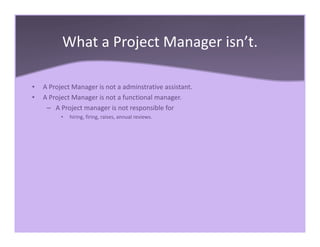 A project manager is responsible for coordinating all aspects of a project to bring the project to completion on time, within budget, and according to specifications. They are not administrative assistants or functional managers. The Project Management Institute (PMI) provides global standards for project management practices and certifies project managers through the Project Management Professional (PMP) credential. To become PMP certified requires passing an exam and maintaining certification through ongoing training. The PMBOK Guide from PMI outlines 10 knowledge areas and 47 processes that project managers use to initiate, plan, execute, monitor and control, and close projects.
