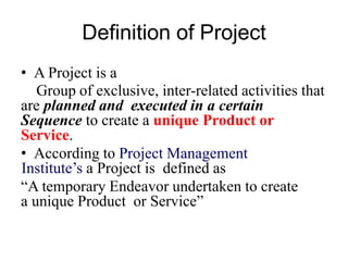 This document discusses project management and project selection methods. It defines a project, outlines the project management lifecycle which includes initiation, planning, execution, monitoring and control, and closure. It then discusses two main methods for selecting projects - benefit measurement methods and constrained optimization methods. Benefit measurement methods include discounted cash flow, cost benefit analysis, payback period, net present value, opportunity cost, scoring models, and economic model. Constrained optimization methods include linear programming, nonlinear programming, integer programming, dynamic programming, and multiple objective programming.