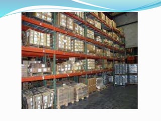 This document discusses production management and material management. It covers various topics related to warehousing including definitions, types (private, public, contract, cooperative), functions, organization, machines used, centralization vs decentralization, rationale, needs, principles, quality decisions, problems, and importance. The main points are that warehousing is important for inventory management, facilitates production, provides flexibility, reduces costs and risks, and ensures materials are available when and where needed. It discusses different types of warehouses and considerations for organizing warehouse operations.