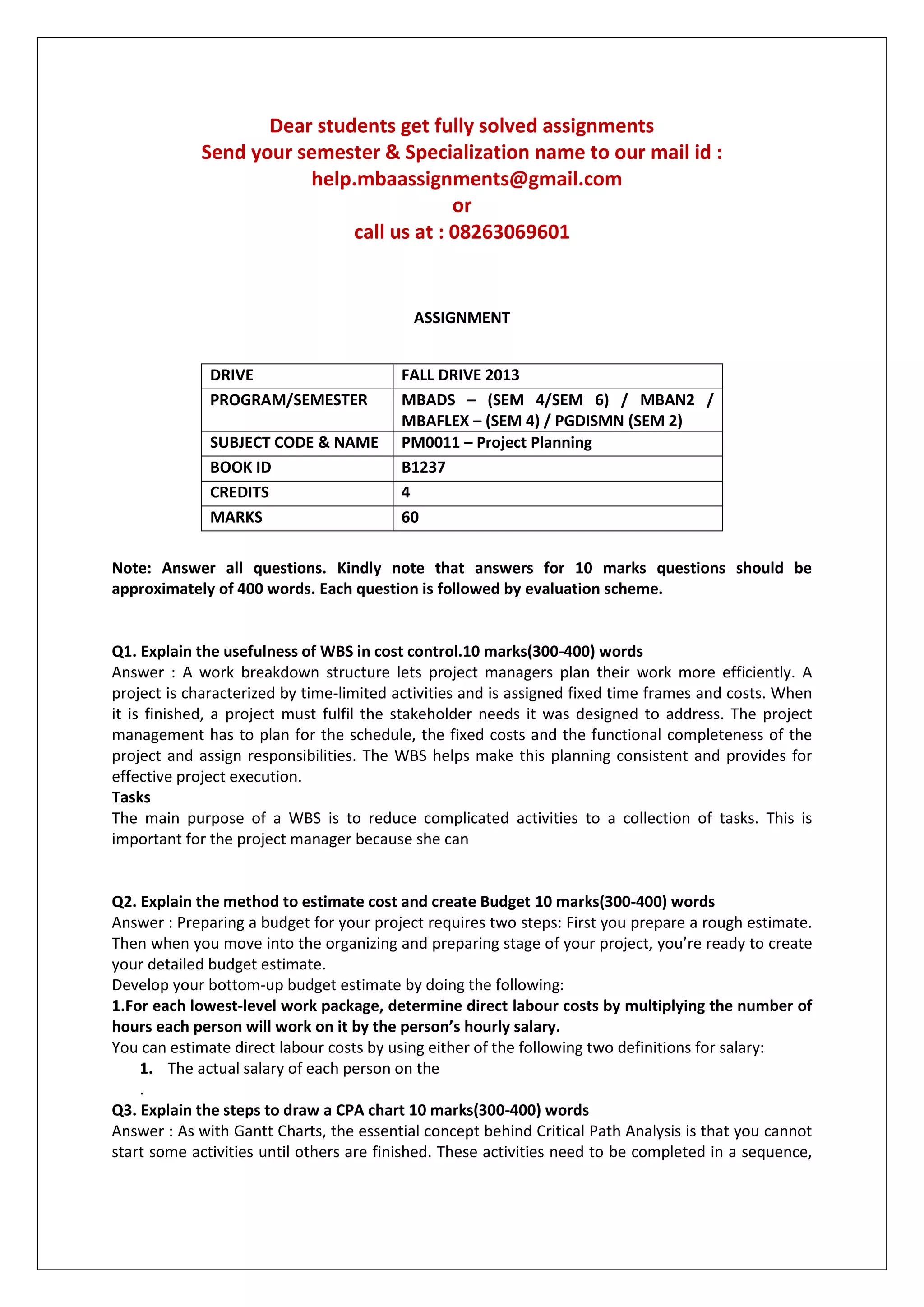 This document provides information about an assignment for the Fall 2013 semester. It includes details like the program/semester, subject code and name, book ID, credits, and marks. It also includes 6 questions related to project planning and asks students to answer each question in 300-400 words. The questions cover topics like explaining the usefulness of a work breakdown structure, estimating project costs and creating a budget, drawing a critical path analysis chart, solving linear programming problems, writing a process review report, and discussing the impact of life cycle costing on new product selection and strategy. Students are instructed to answer all questions and provide approximately 400 words for each 10-mark question.