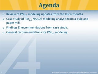 The document presents updates and recommendations on PM2.5 modeling for compliance with National Ambient Air Quality Standards (NAAQS). It discusses recent regulatory changes, case studies, and approaches for evaluating PM2.5 emissions from industrial sources. Additionally, it emphasizes the need for accurate modeling and monitoring to ensure environmental compliance.