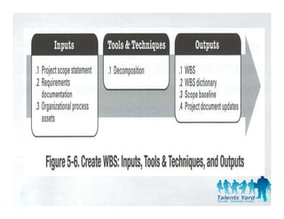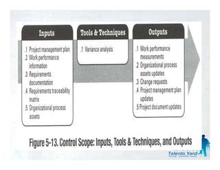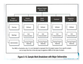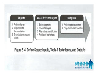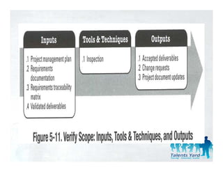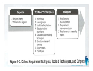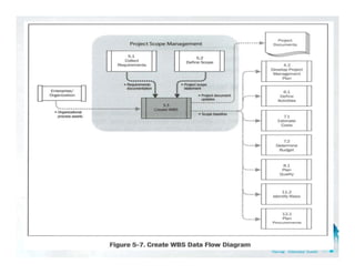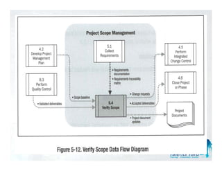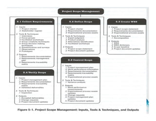 Chapter 5 of the document outlines project scope management, detailing processes to ensure projects include only the required work for successful completion. It discusses key processes such as collecting requirements, defining scope, creating a WBS, verifying scope, and controlling scope, emphasizing the importance of managing stakeholder needs and expectations. The document also describes tools and techniques for gathering requirements and ensuring effective communication and decision-making among project stakeholders.