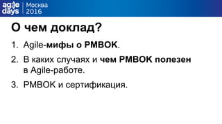 Доклад Василия Чепцова обсуждает полезность PMBOK для agile-менеджеров, развеивая мифы о противоречии PMBOK и agile-методов. PMBOK может быть полезен для управления проектами с внешними зависимостями и планирования на длительный срок, но также описывает, как интегрировать agile-подходы. Сертификация PMI ценится и помогает углубить знания в управлении проектами.