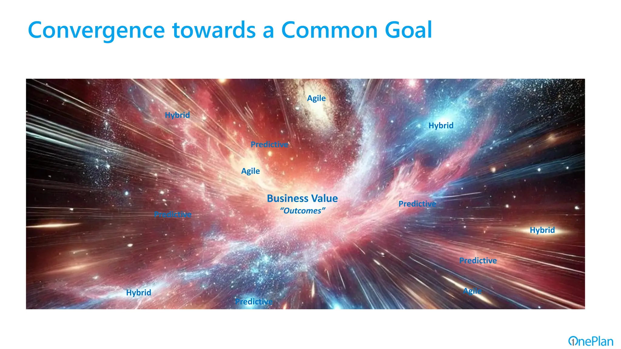 The document discusses the transition from process-based to principles-based project management as outlined in PMI's PMBOK Guide 7th edition, emphasizing a focus on value delivery and stakeholder engagement. It highlights the benefits of adopting flexible, outcome-oriented approaches such as predictive, agile, and hybrid methodologies for project success. Additionally, it introduces OnePlan, a solution for adaptive project portfolio management that integrates AI-driven insights for strategic decision-making and resource optimization.