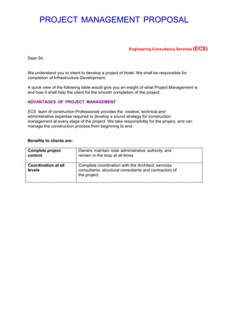 Engineering Consultancy Services (ECS) is proposing project management services for a new hotel development project. As part of the proposal, ECS would be responsible for managing all infrastructure development, coordinating with consultants and contractors, and ensuring the smooth and timely completion of the project. ECS would provide a full range of project management services including cost control, scheduling, procurement, construction management, quality assurance, and handing over completed operational manuals and as-built drawings. Sufficient experienced engineers would be deployed at the site to oversee daily development activities.