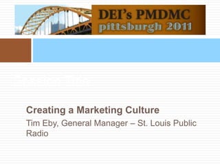 The document discusses how St. Louis Public Radio created a marketing culture through their 2009 rebranding, regional programming focus, and new facility. It describes how the rebranding, programming focus on St. Louis, and building of a new campus helped shape an inclusive marketing culture through transparency, community engagement, and partnerships. This resulted in revenue growth through increased individual giving and corporate sponsorships as well as audience growth in radio listeners and web visits.