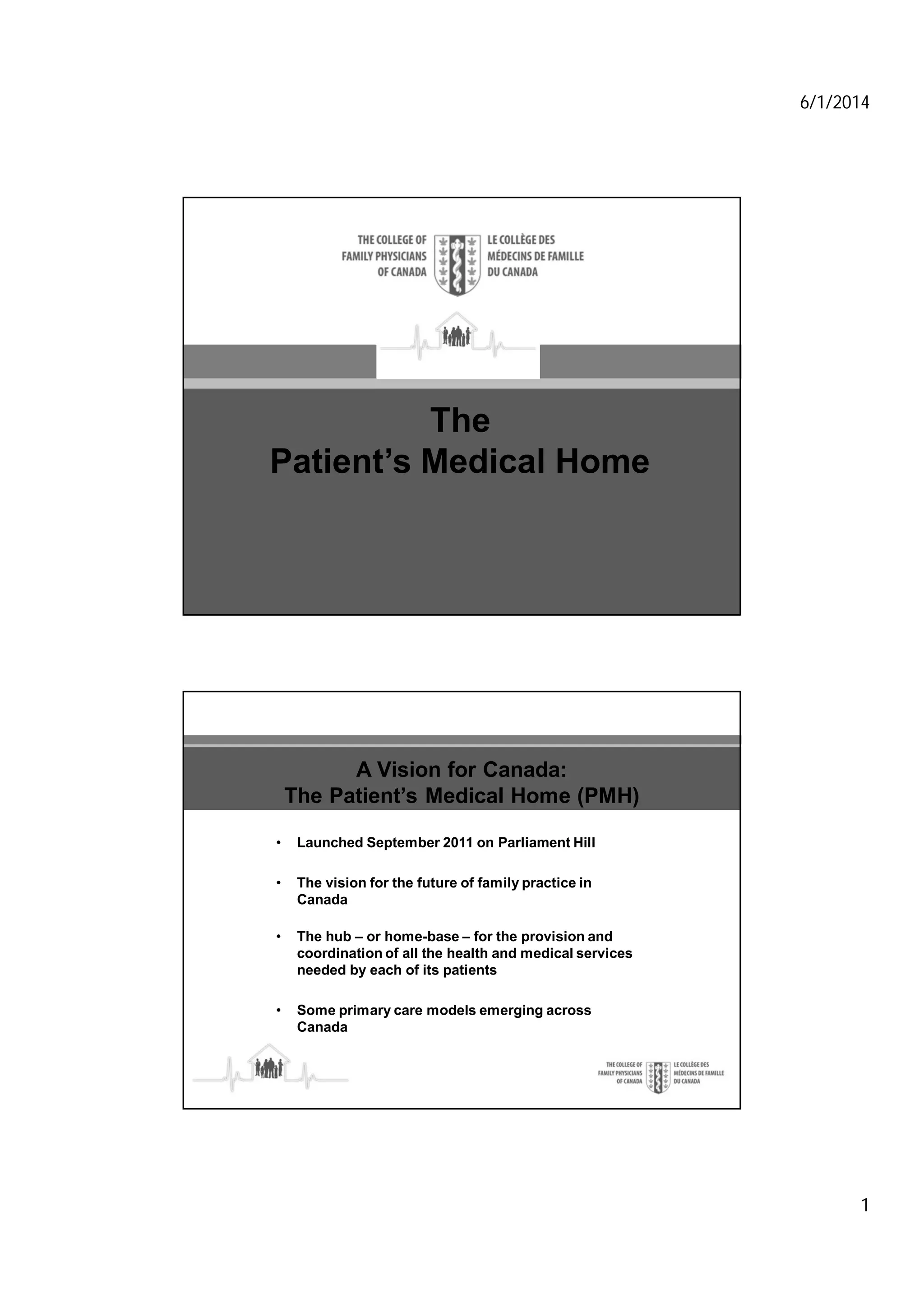 This document outlines the vision and goals of the Patient's Medical Home (PMH) model in Canada. The PMH aims to establish family practices that serve as a patient-centered medical home, providing comprehensive and coordinated care for patients. It describes 10 goals of the PMH approach, including making every patient part of a practice with a personal family doctor, providing timely access to care, and supporting practices through governance and other stakeholders. The document also discusses insights from studies in the US and Canada on factors that can improve quality and lower costs within the PMH model.