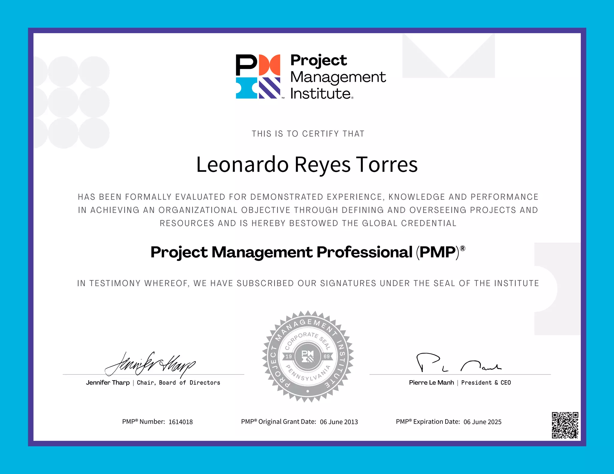 This document certifies that Leonardo Reyes Torres has been granted the credential of Project Management Professional (PMP) by demonstrating experience, knowledge, and performance in defining and overseeing projects and resources to achieve organizational objectives. It is signed by the Chair of the Board of Directors and President & CEO of the certifying institute and includes Torres' PMP number and dates the certification was originally granted and will expire.