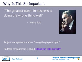 The document discusses the importance of project portfolio management (PPM) in selecting and prioritizing projects based on their value and alignment with business objectives. It outlines a structured, step-by-step approach to project selection, evaluation, and prioritization, emphasizing the need for transparency, stakeholder support, and alignment with organizational goals. Key elements include scoring criteria, categorization of projects, and ensuring that the selected initiatives deliver the expected benefits while managing available resources effectively.