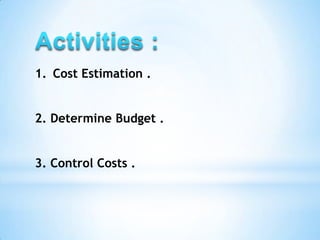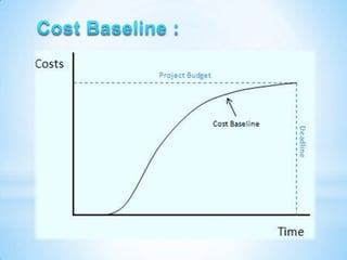 The document discusses cost estimation and control for projects. It outlines inputs, techniques, and outputs for estimating costs, developing a cost baseline and budget, and controlling costs using earned value management. Key steps include determining the project scope and work breakdown structure, developing cost estimates, setting a budget, and monitoring performance to track cost and schedule variance and forecast estimates to completion. The goal is to deliver the project according to the approved scope within the allocated time and funds.