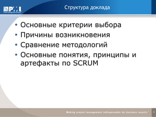 Документ представляет собой обзор гибких методологий разработки программного обеспечения, включая их историю, принципы и сравнение с традиционными подходами. Гибкие методологии, такие как Scrum, акцентируют внимание на итеративной разработке, удовлетворении потребностей клиента и вовлеченности конечных пользователей. В документе также рассматриваются преимущества и недостатки различных методологий, а также критерии выбора подхода для проектов.