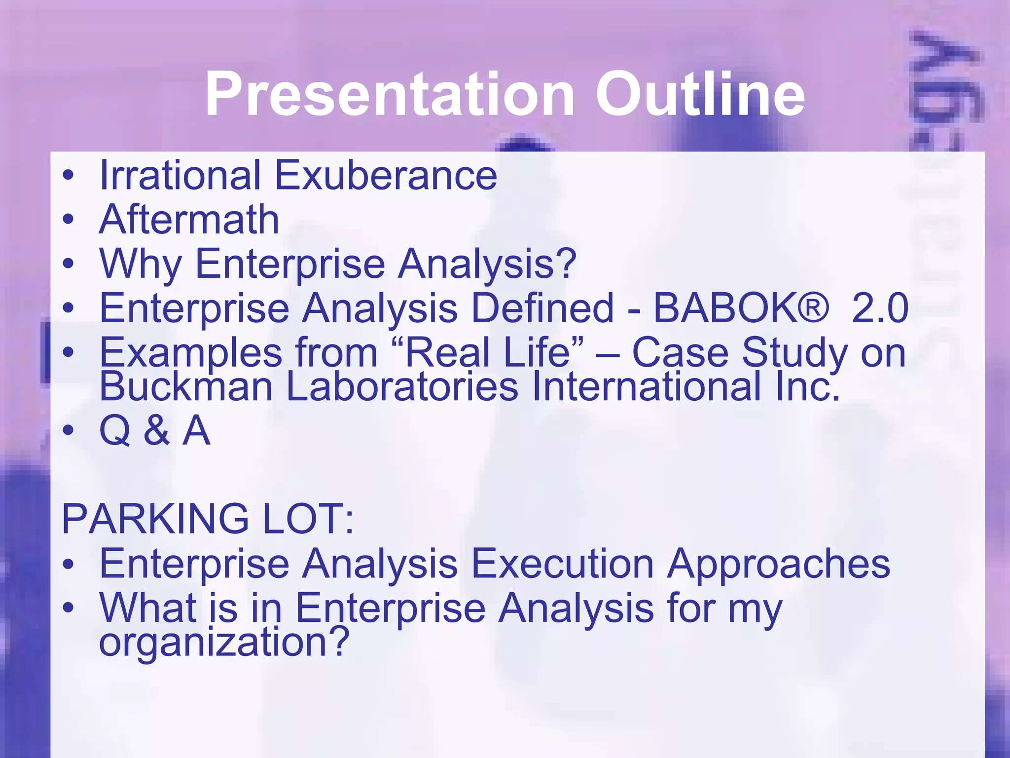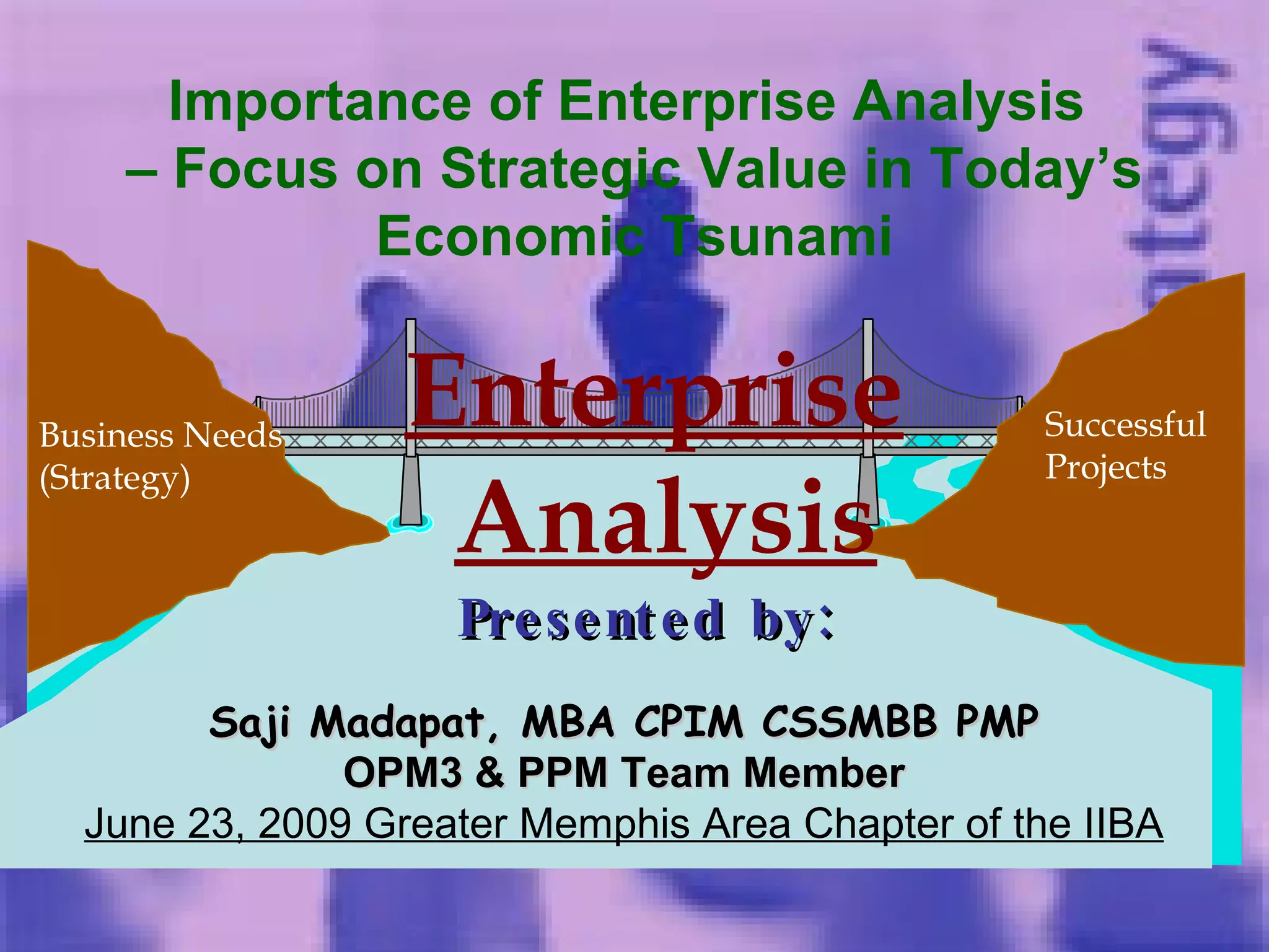 The document discusses the importance of enterprise analysis for organizations. It provides examples from Buckman Laboratories, a global specialty chemicals company, which successfully weathered economic downturns through enterprise analysis. Buckman analyzed its business needs, capability gaps, and implemented a global business system with a single platform, team, infrastructure and consolidated reporting. This reduced costs, improved coordination and business performance. Enterprise analysis allows organizations to prioritize resources and projects to achieve strategies during difficult economic times.