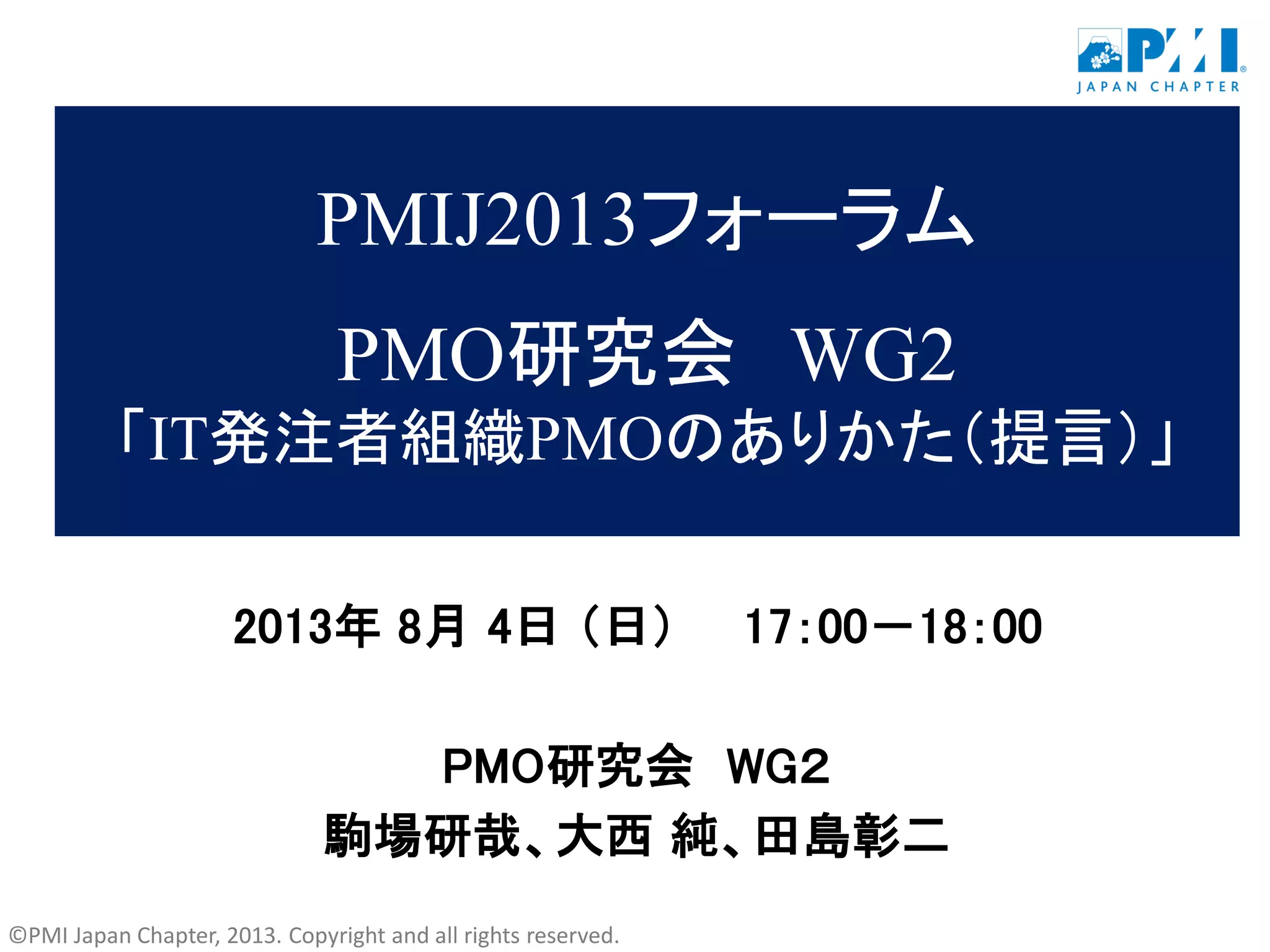 2013. Copyright and all rights reserved. PMIJ2013フォーラム PMO研究会 WG2 「IT発注者組織PMOのありかた(提言)」 2013年 8月 4日 (日) 17:00-18:00 PMO研究会 WG2 駒場研哉、大西 純、田島彰二
