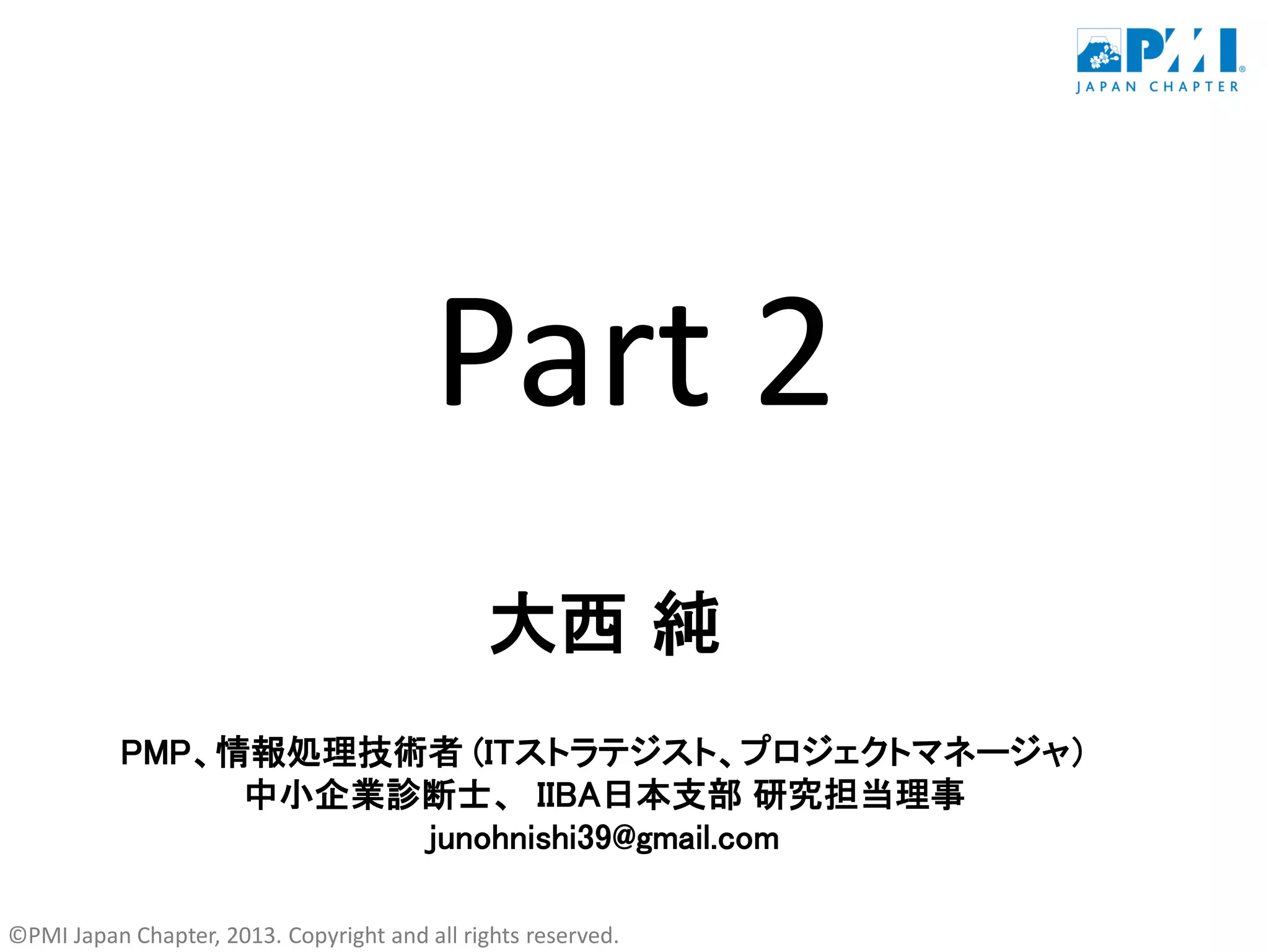 2013. Copyright and all rights reserved. Part 2 大西 純 PMP、情報処理技術者 (ITストラテジスト、プロジェクトマネージャ) 中小企業診断士、 IIBA日本支部 研究担当理事 junohnishi39@gmail.com
