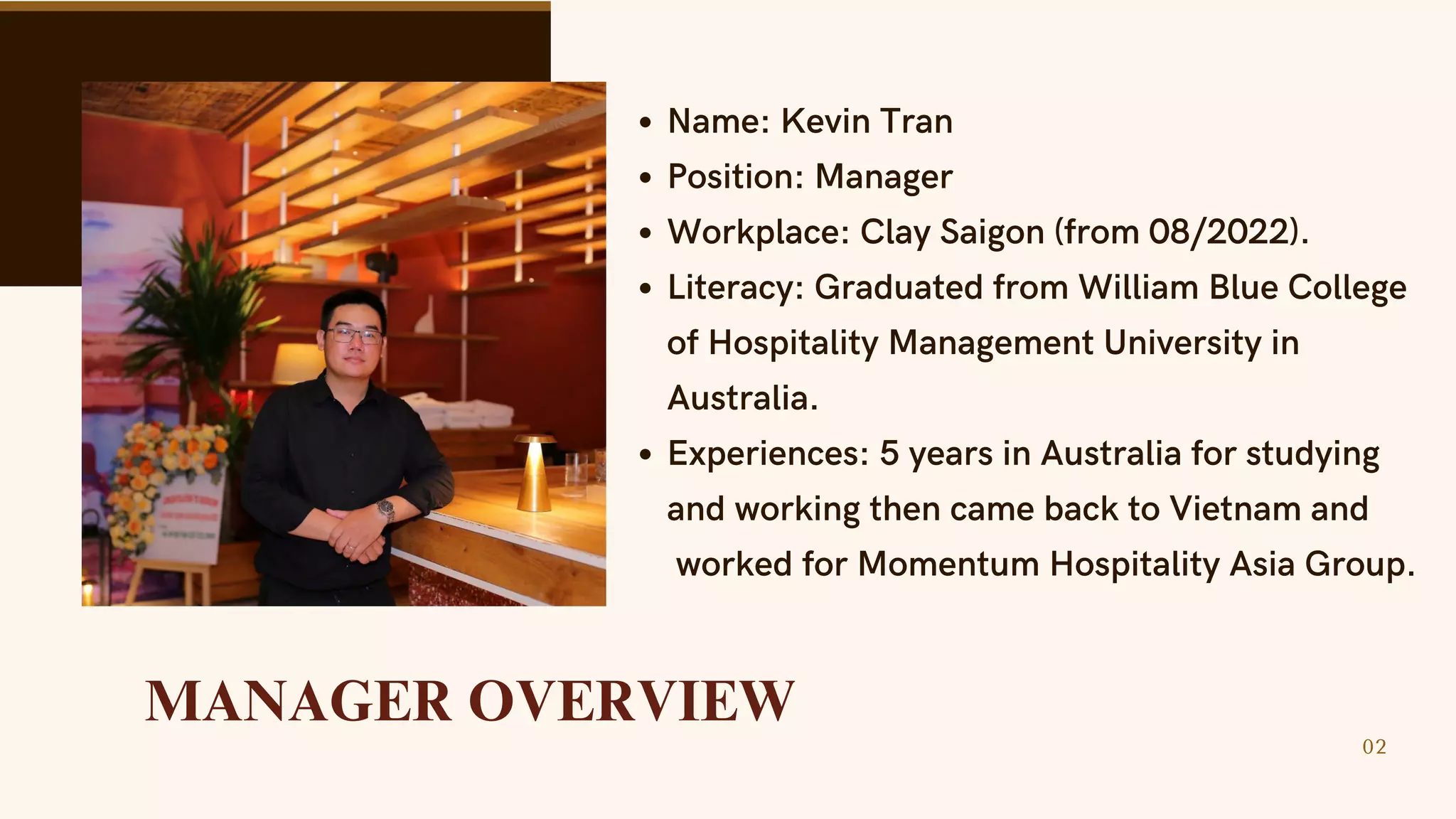 Kevin Tran is the manager of Clay Saigon hotel. He has 5 years of experience in the hospitality industry in Australia and Vietnam. As the manager, his big challenges include accommodating customer demands when staff cannot satisfy them and resolving conflicts between customers and staff.