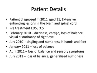 This case study describes a patient with relapsing-remitting MS who was treated with natalizumab (Tysabri) between 2010-2011. In March 2011, she had an abnormal brain lesion detected on a surveillance MRI. Over the next few months her condition progressively declined, with developing weakness and sensory symptoms. Further MRIs and lumbar punctures were consistent with a diagnosis of progressive multifocal leukoencephalopathy (PML) induced by her treatment with natalizumab. She underwent plasma exchange treatment but continued to deteriorate clinically.