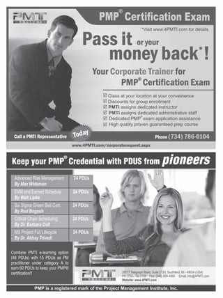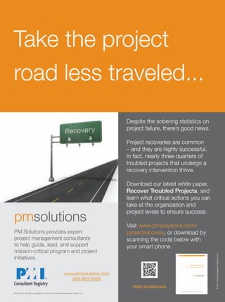 The document is the March 2012 issue of PM Network, the monthly magazine of the Project Management Institute (PMI). It contains several articles on various project management topics such as cloud computing security, stakeholder perceptions, mass IT system migrations, and career advice. The issue also previews upcoming webinars and conferences. Key articles discuss managing risk quantitatively, moving a city's IT systems to a new server, and four time management strategies used by project professionals.