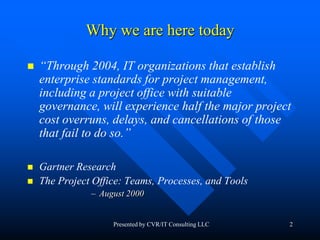 This document discusses creating a charter for a Project Management Office (PMO). It begins by explaining what a PMO is and what functions it can perform. It emphasizes that a PMO charter is needed to define the purpose and functions of the PMO for the specific organization. The document then provides guidance on developing a PMO charter, including gathering information on the mission, objectives, functions, critical success factors, metrics, staffing structure, and budget. It recommends using a template to help capture all the necessary information to define the PMO for the organization.