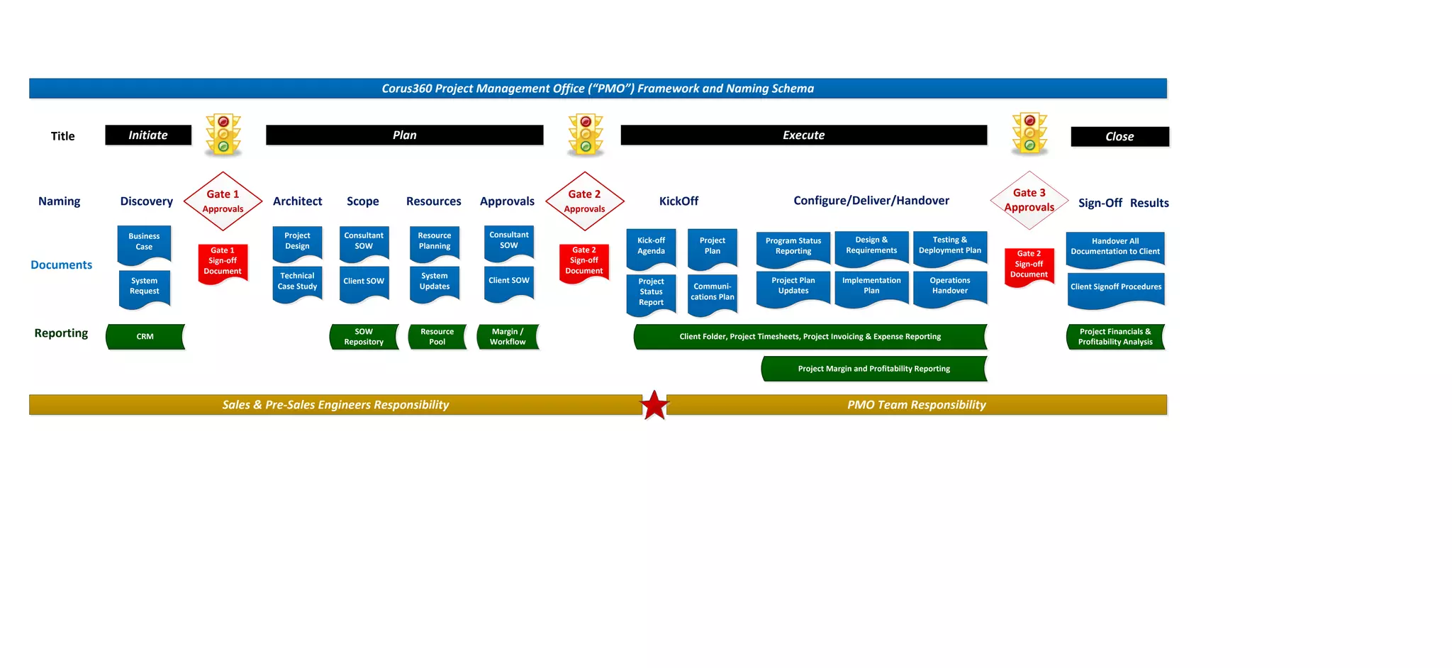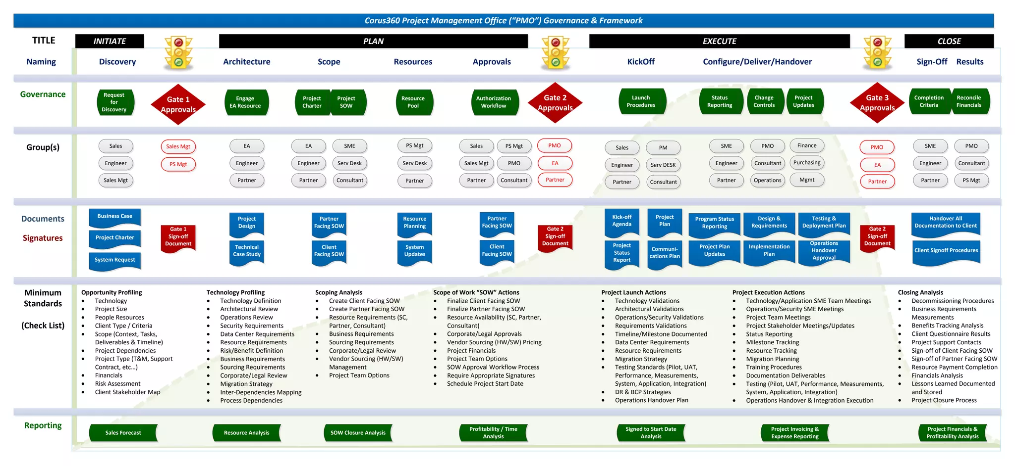 This document outlines the processes and procedures for managing discovery projects at Corus360, including governance groups, documentation requirements, and project lifecycle stages from initiation to close. It details the roles and responsibilities of various teams in sales, engineering, project management, and operations. Key aspects of the framework include governance approvals at three gates, status reporting, and financial analysis to track project profitability.