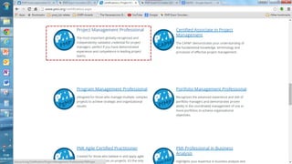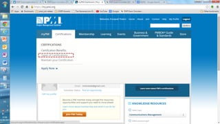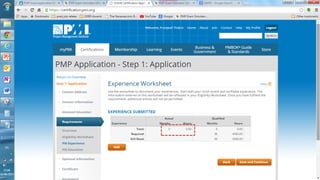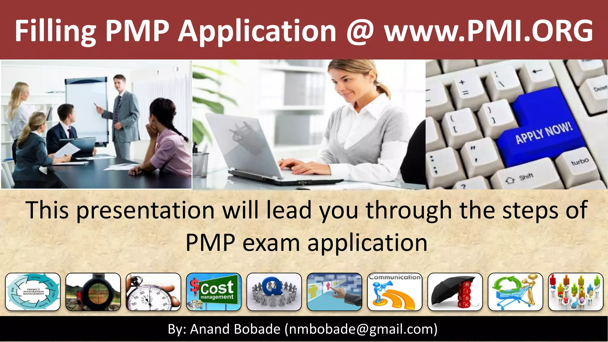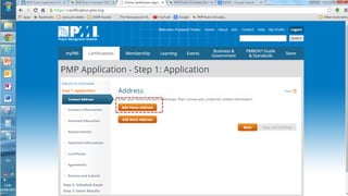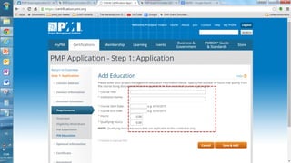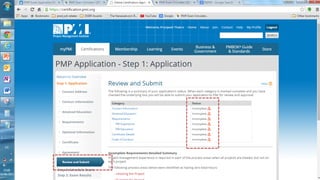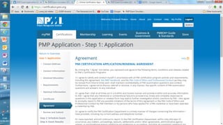This presentation outlines the 5 steps to fill out the 9 page PMP certification application on the PMI website: 1) Create an account if needed and log in, 2) PMI will review the application for completeness within 5 days, 3) Pay the application fee online and select an exam delivery method, 4) Be prepared to submit audit materials within 90 days if randomly selected for audit, and 5) Schedule the PMP exam on the Prometric website.