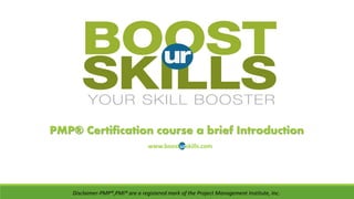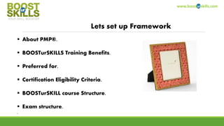 This document provides an introduction to the PMP certification course offered by BOOSTurSKILLS. It outlines the benefits of the course, including gaining project management knowledge, PDU credits, and access to a professional network. It describes the eligibility criteria for the PMP certification, including education and experience requirements. It also gives an overview of the structure of the BOOSTurSKILLS training course, which covers the 10 knowledge areas and 5 process groups over 4 days of instruction. Finally, it provides details on the PMP exam, such as the 200 questions, 4 hour duration, and percentage of questions in each process group.