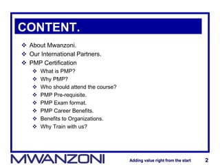 Mwanzoni Limited specializes in project management training, offering PMP® certification that enhances individual and organizational project delivery capabilities. The document outlines the benefits of PMP® certification for career advancement and organizational expertise, along with prerequisites and exam details. Additionally, it highlights international partnerships and training quality, positioning Mwanzoni as a trusted provider in project management education.