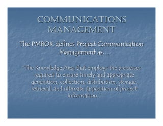 The document outlines the key aspects of communications management in project management as per the PMBOK, stressing the importance of effective communication to avoid project failures. It includes an analysis of communication planning, information distribution, performance reporting, and stakeholder management, highlighting the tools and techniques necessary for successful communication. It also emphasizes the need for feedback, technological adaptation, and regular lessons learned sessions to enhance future project efficiency.
