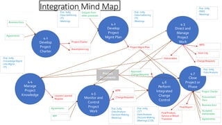 This document provides a mind map overview of the processes involved in project integration management. It outlines seven key processes: develop the project charter, develop the project management plan, direct and manage project work, manage project knowledge, monitor and control project work, perform integrated change control, and close the project or phase. For each process, it lists the typical inputs, tools and techniques, and outputs involved. The mind map provides a high-level view of the integration of all project management processes.