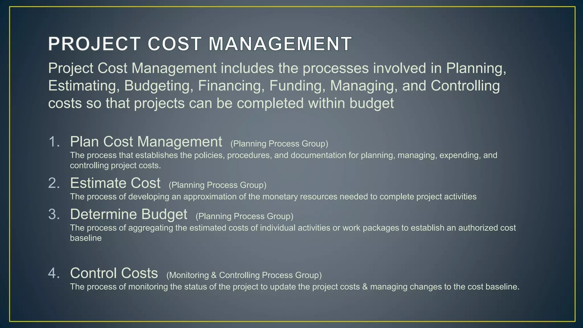 Plan Cost Management establishes the policies, procedures, and documentation for planning, managing, expending, and controlling project costs. It provides guidance on how project costs will be managed throughout the project. Estimate Cost develops an approximation of the monetary resources needed to complete project activities using techniques like expert judgment, analogous estimating, and three-point estimating. Determine Budget aggregates the estimated costs of activities to establish an authorized cost baseline against which performance can be monitored. Control Costs monitors project costs and manages changes to the cost baseline using earned value management, forecasting, and performance reviews to recognize variances and take corrective action.