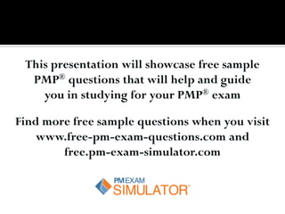 This document provides sample PMP exam questions and explanations to assist candidates in their exam preparation. It includes a disclaimer stating that the information does not guarantee success on the exam and highlights the need for official study materials. Key topics include project management processes, risk management, and team training documentation.