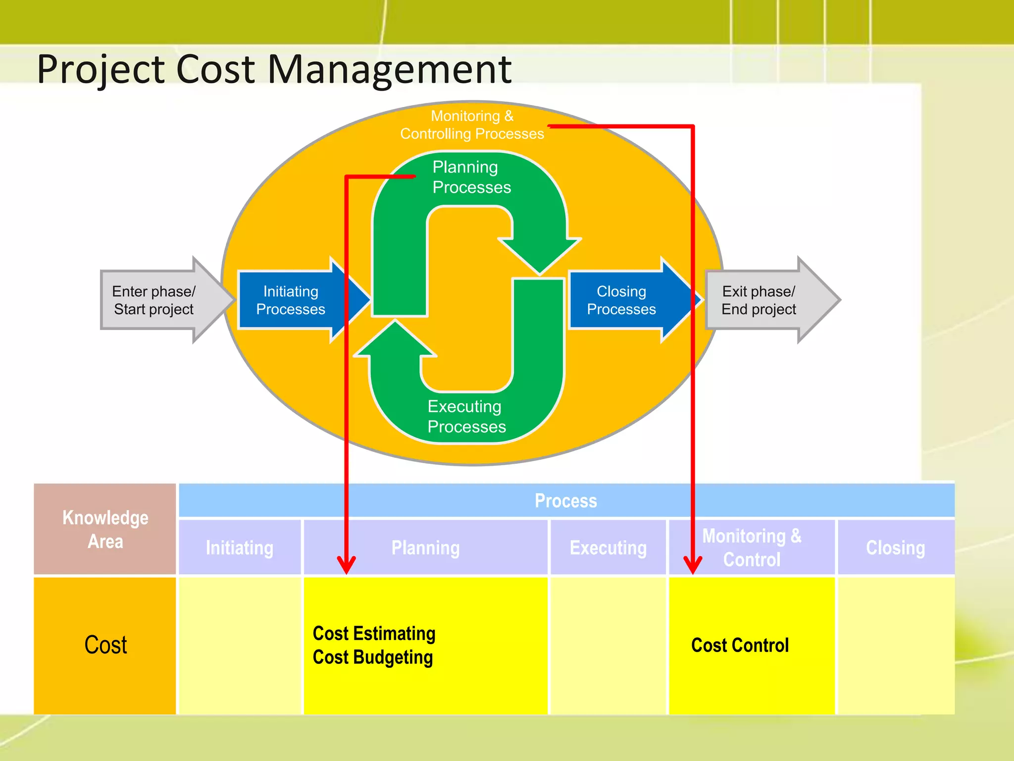 1. Estimating costs, developing budgets, and controlling costs to complete projects within approved budgets. This involves estimating types of costs, quality of estimates, and determining authorized cost baselines.