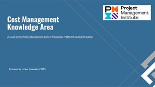 This document provides an overview of project cost management based on the PMBOK Guide. It discusses the key processes involved, including plan cost management, estimate costs, determine budget, and control costs. For each process, it outlines the typical inputs, tools and techniques, and outputs. It also discusses important concepts like the cost management plan, cost baselines, earned value management, variance analysis, and estimating techniques. The overall purpose is to plan, estimate, budget, and control costs throughout the project life cycle.