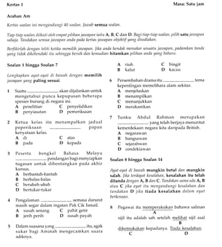 Dokumen ini mengandungi arahan dan soalan untuk ujian yang terdiri daripada 40 soalan pelbagai pilihan. Setiap soalan memerlukan pemilihan jawapan yang tepat dan memberi panduan khusus tentang cara menjawab serta mengecam kesalahan dalam ayat. Ujian ini juga meliputi ujian pemahaman bacaan melalui petikan cerpen dan sajak, serta menilai pengajaran yang boleh diambil dari bahan tersebut.