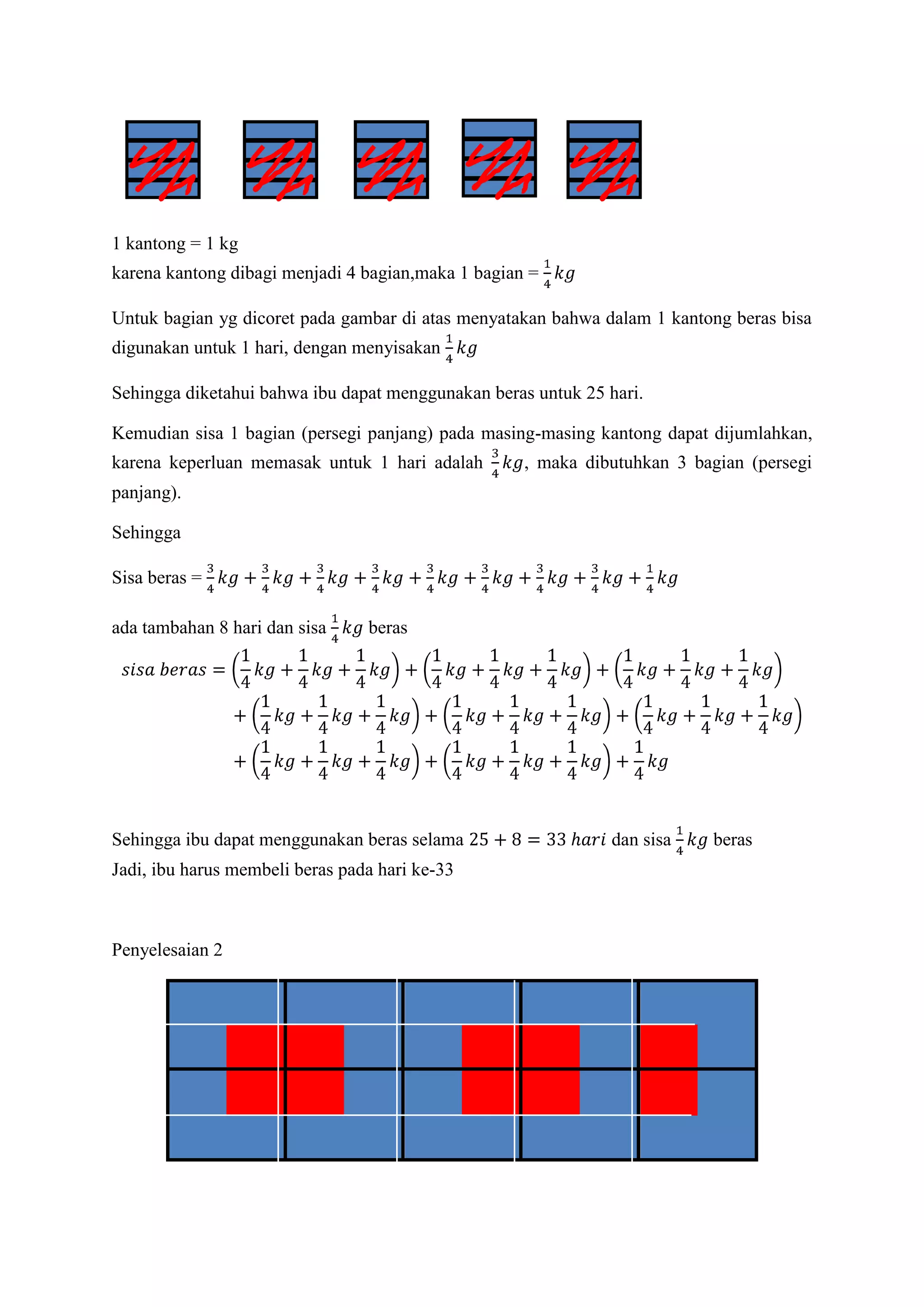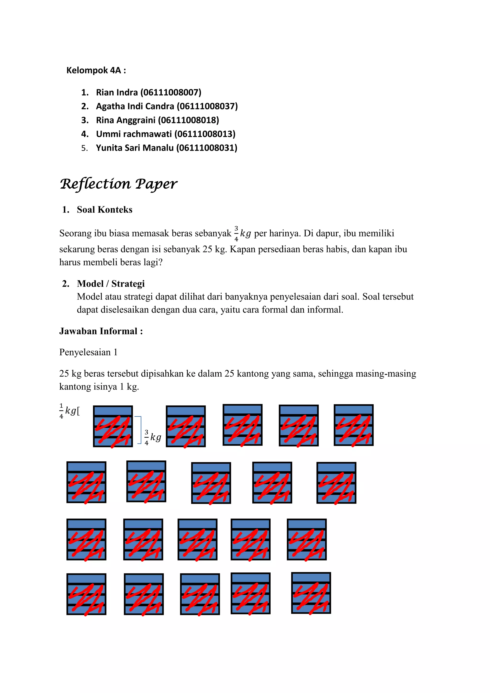 Dokumen tersebut merangkum diskusi kelompok siswa tentang penyelesaian soal konteks memasak beras oleh seorang ibu. Ada beberapa penyelesaian informal dan formal yang diajukan siswa dengan menggunakan berbagai konsep matematika seperti pecahan, perkalian, pembagian, dan geometri. Guru memfasilitasi diskusi dan refleksi siswa untuk menarik kesimpulan dari pelajaran hari ini.