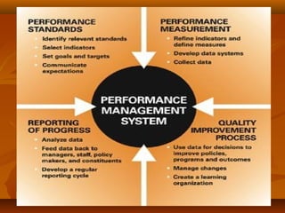 The document discusses performance management systems (PMS). It states that a PMS provides a structured approach to communicate business strategy, establish shared understandings of goals, facilitate self and peer management, measure and motivate performance. A PMS consists of setting employee expectations, maintaining dialogue to monitor performance, and conducting annual reviews. It is used to address underperformance, encourage development, and determine performance-based pay and promotions. Key aspects of an effective PMS include setting key result areas, providing feedback, and linking performance to rewards and career progression.