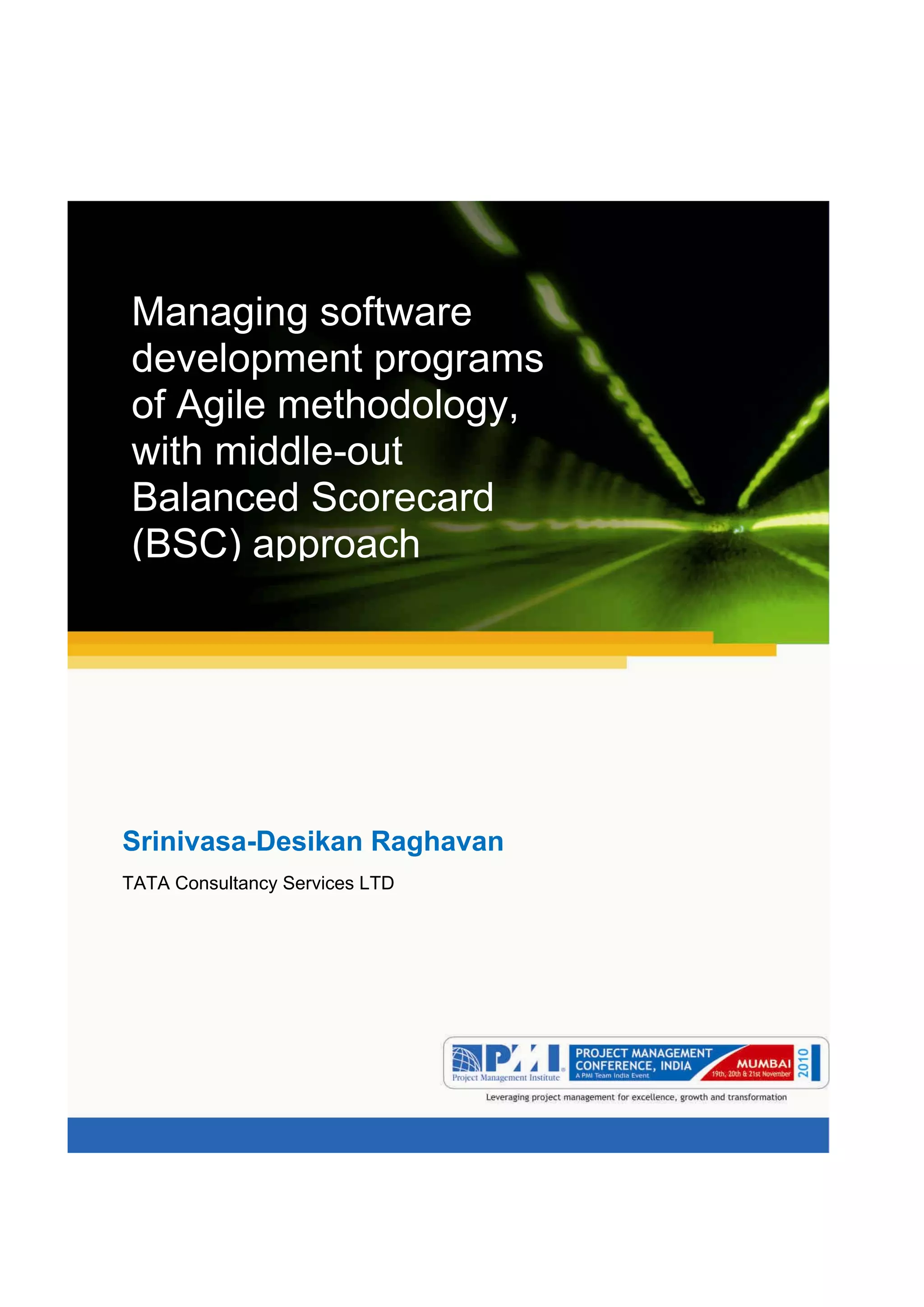 This document describes using a Balanced Scorecard (BSC) approach to manage an Agile software development program with multiple Scrum teams. It involved designing a "middle-out" BSC that cascaded goals and measures from the program level down to individual Scrum teams while also aggregating measures up from the teams. Key aspects included developing strategy maps, identifying measures and targets, and calculating performance indices to monitor progress. The BSC provided a common dashboard to facilitate communication among stakeholders at different levels.