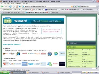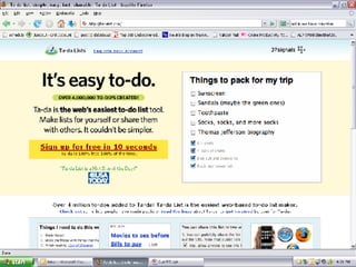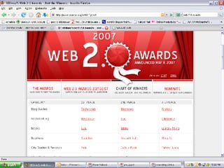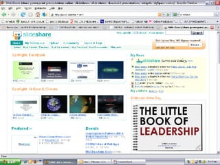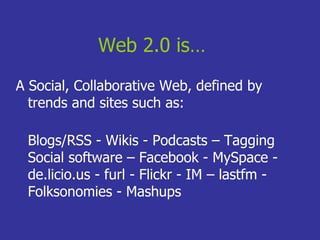 This document summarizes Web 2.0 tools that can enhance productivity including social networking sites like Facebook and Flickr, collaborative tools like wikis and blogs, and file sharing/conversion tools like Zamzar and Omnidrive. It provides examples of real-time collaboration tools like Writeboard and online photo editing with Picnik. The presentation encourages participants to explore the potential of these new technologies and how harnessing collective intelligence through tools like folksonomies and wikis can change how information is accessed and shared.