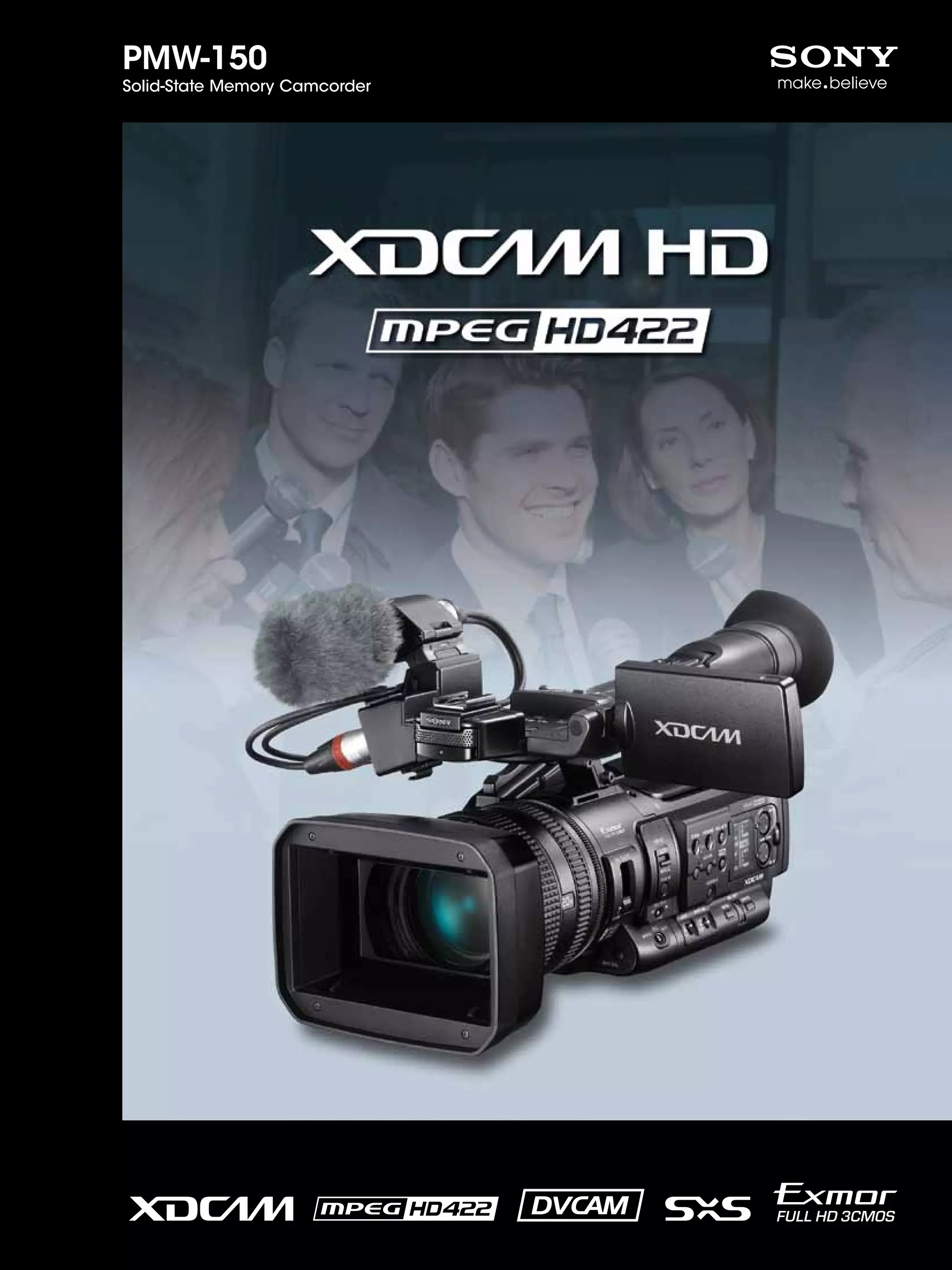The PMW-150 is a compact, handheld camcorder with three 1/3-inch CMOS sensors that achieve broadcast quality in HD. It has high sensitivity of F10 and S/N ratio of 54dB due to the new sensors. It provides various manual controls, focus assist functions, and records in MPEG HD422 up to 50Mbps for broadcast use. Optional accessories allow wireless control and extended recording time of up to 4 hours.