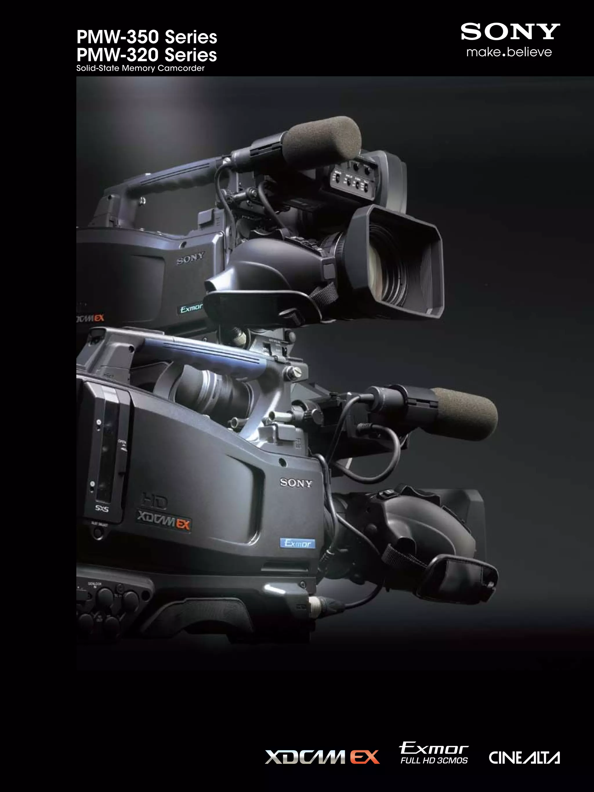 The PMW-350 and PMW-320 are new shoulder-mount camcorders from Sony that offer 1080p HD recording using SxS memory cards. They are equipped with three "Exmor" CMOS sensors that provide high quality images with low noise. The camcorders offer multiple recording formats including 1080p, 720p, and DVCAM. They also feature a variety of functions such as native 23.98p recording, slow and quick motion recording, and four channel audio. The camcorders are designed for mobility with a compact body and long battery life, while also offering creative tools and a future-proof design.
