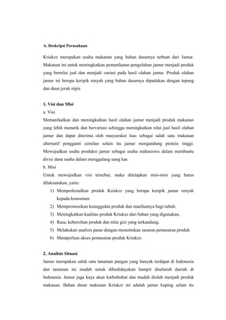Proposal ini mengusulkan program penelitian inovatif mahasiswa tentang usaha produksi keripik jamur bernama Kriukzz. Produk ini memanfaatkan jamur kuping sebagai bahan baku utama dan akan dipasarkan kepada mahasiswa dan masyarakat sekitar kampus. Rencananya usaha ini akan membantu meningkatkan pendapatan mahasiswa serta memperkenalkan variasi makanan berbahan dasar jamur.
