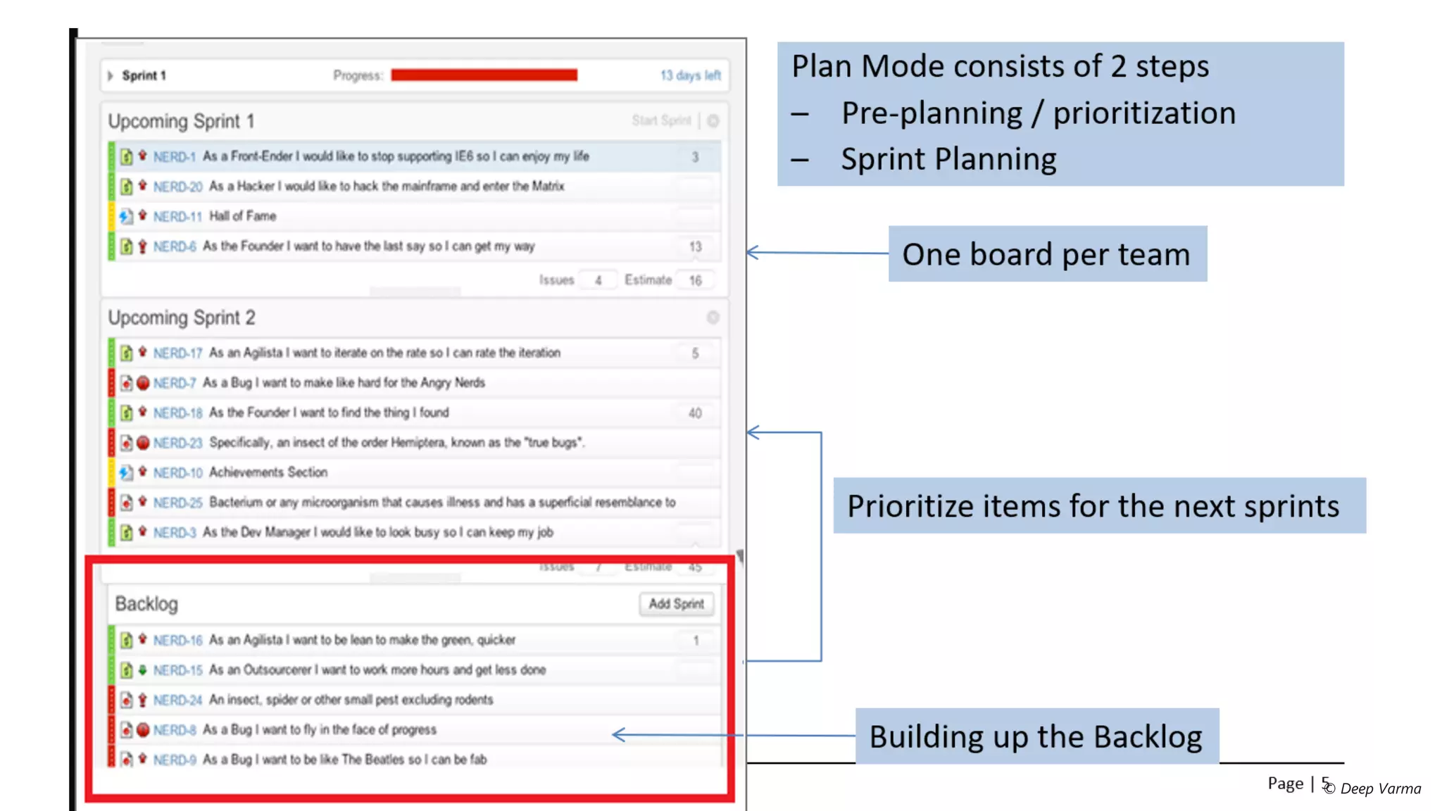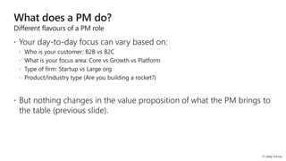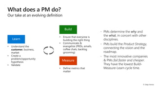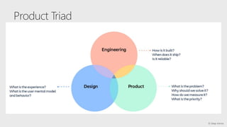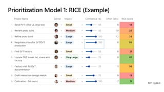 The document outlines an agenda for a product management workshop focusing on understanding customers through profiling, mapping their journeys and goals, prioritizing features based on their impact and feasibility, and developing strategies for product marketing and metrics. Customer research methods like typology and psychographics are discussed to gain insights into pain points and opportunities. An overview of agile product development processes like sprints, artifacts, and rituals is also provided.