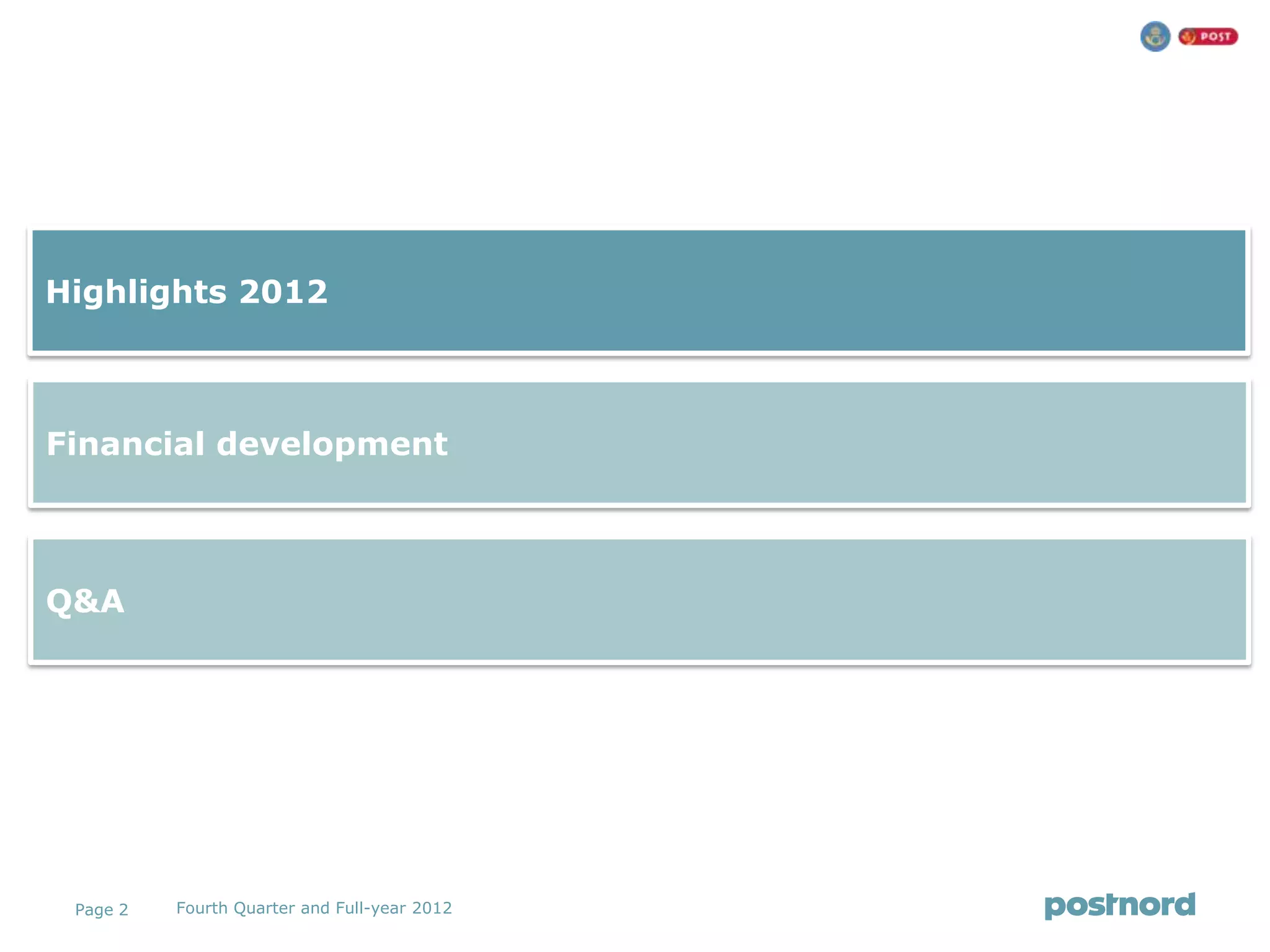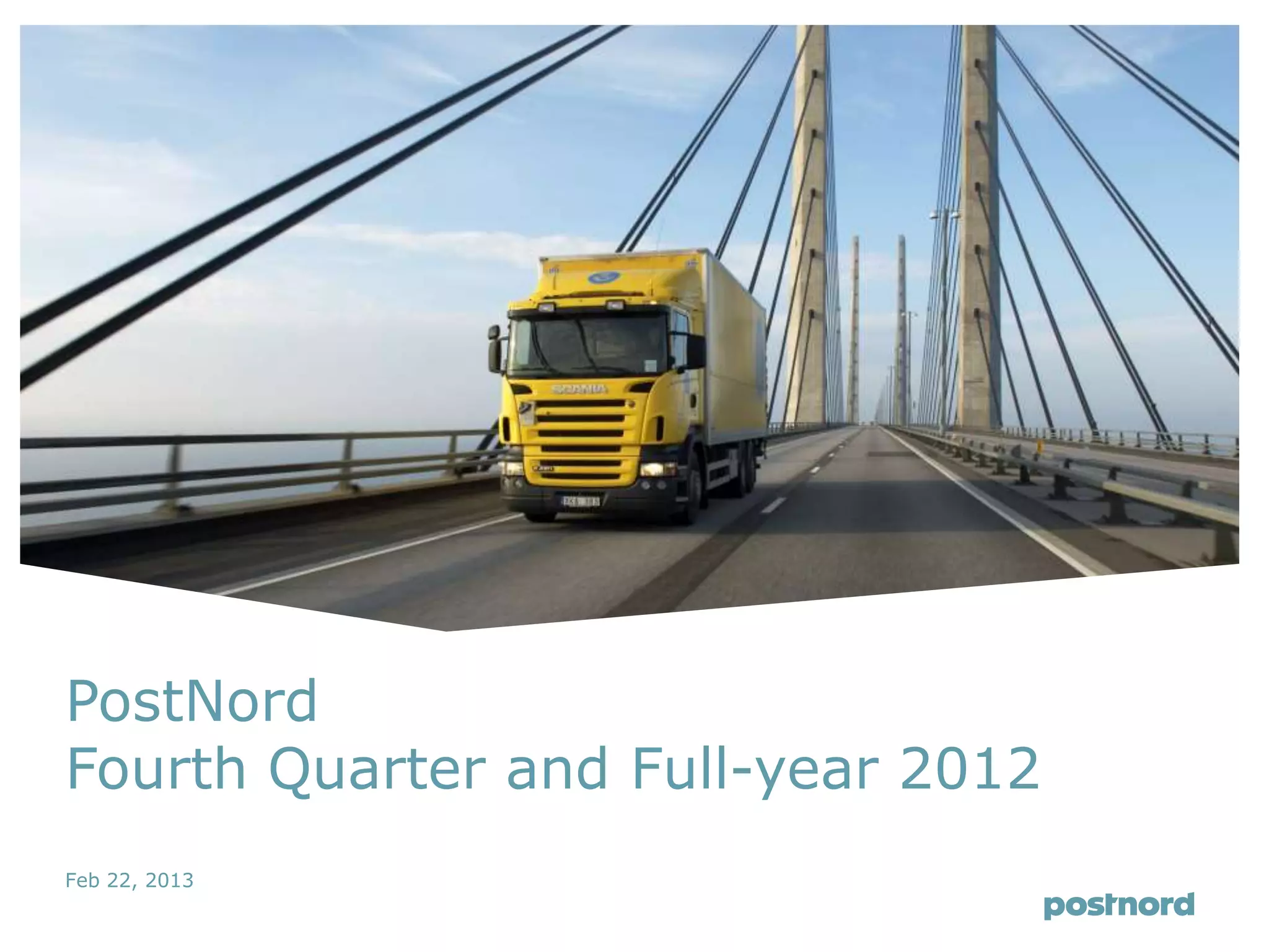 PostNord reported satisfactory annual results for 2012, maintaining efforts to convert operations amid declining letter volumes. Net sales were unchanged in Q4 2012 and fell 1% for the full year. Adjusted operating profit was SEK 549m in Q4 and SEK 1,550m for 2012. Results were impacted by SEK 600m in restructuring costs and write-downs in Q4 and SEK 1,400m for the full year. The Mail business stabilized its underlying margin despite a 7% volume decline for the year. Logistics grew sales 8% in Q4 and 1% for the year on increased e-commerce volumes, and also acquired complementary businesses. Strålfors achieved profitability following stream