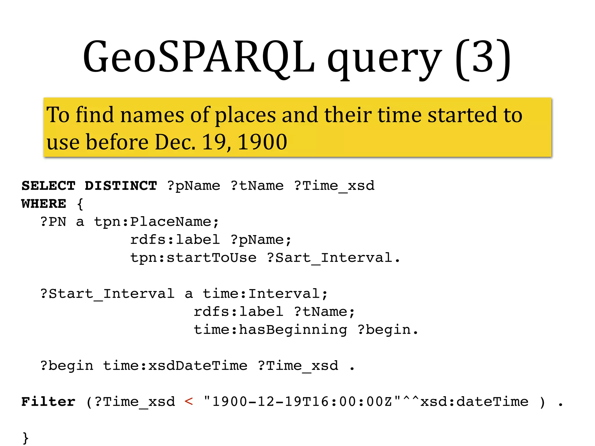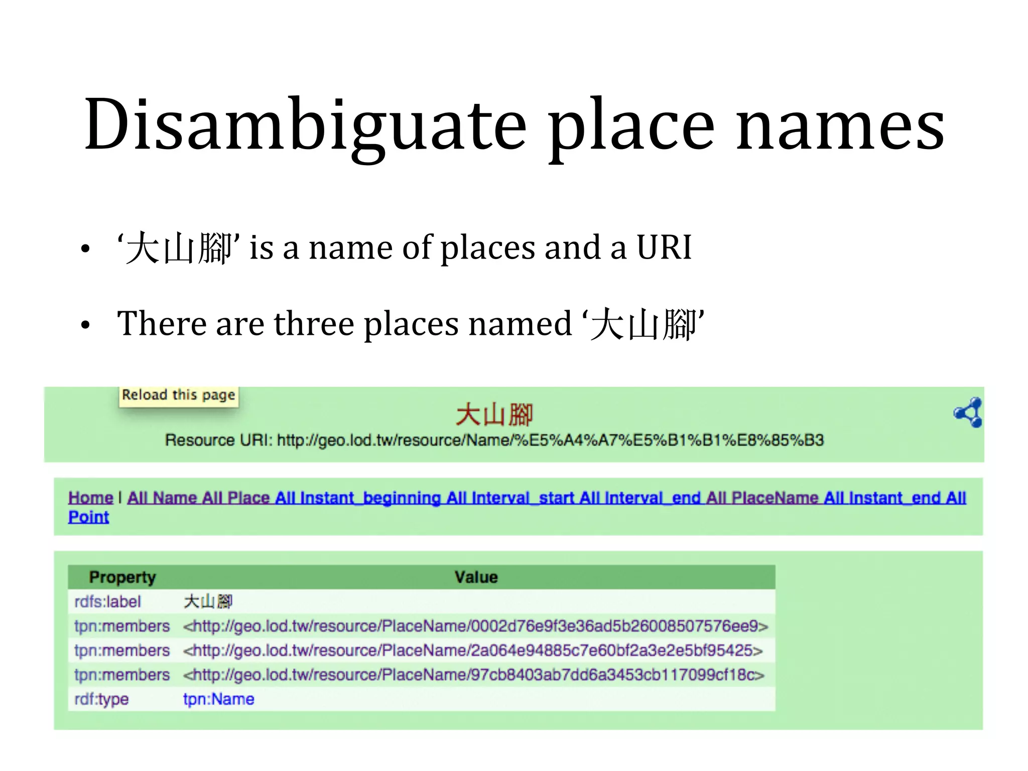 This document summarizes Dongpo Deng's presentation on developing linked geoname data using GeoSPARQL. It discusses transforming a Taiwanese place name dataset into RDF triples using a place name ontology. A linked data server and GeoSPARQL endpoint were created to serve and query the linked place name data. Spatial and temporal SPARQL queries over the data were demonstrated. The linked place names can be used as controlled vocabularies and are connected to other datasets like Geonames.org.