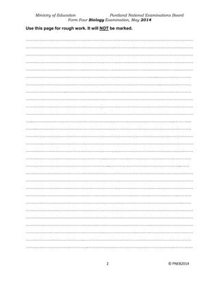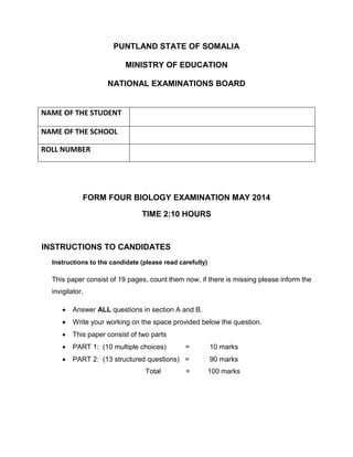 This document provides instructions for a Form Four Biology exam in Puntland, Somalia. It consists of 19 pages testing knowledge of biology concepts. The exam is divided into two parts: multiple choice questions worth 10 marks, and structured questions worth 90 marks, for a total of 100 marks. Candidates are instructed to answer all questions, show their working, and provide identifying information. The document includes sample exam questions on topics like the carbon cycle, human anatomy, cell division, and genetics.