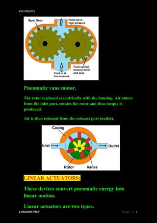 Pneumatic actuators are devices that convert compressed air into motion, commonly used in industrial gripping and moving operations. There are two main types: rotary actuators, which produce rotary motion, and linear actuators, which can be single-acting or double-acting. Single-acting cylinders operate in one direction with a spring, while double-acting cylinders facilitate movement in both extending and retracting strokes.